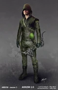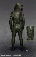 - Durante los eventos de "Penance" y "Bratva", Oliver usó una chaqueta de cuero negro y una máscara balística en lugar de su traje normal. Este atuendo luego se usaría en lugar del disfraz durante los eventos de "Disbanded", "Dangerous Liaisons" y la primera mitad de "Honor Thy Fathers", debido a que se negaba a ponerse la capucha nuevamente.