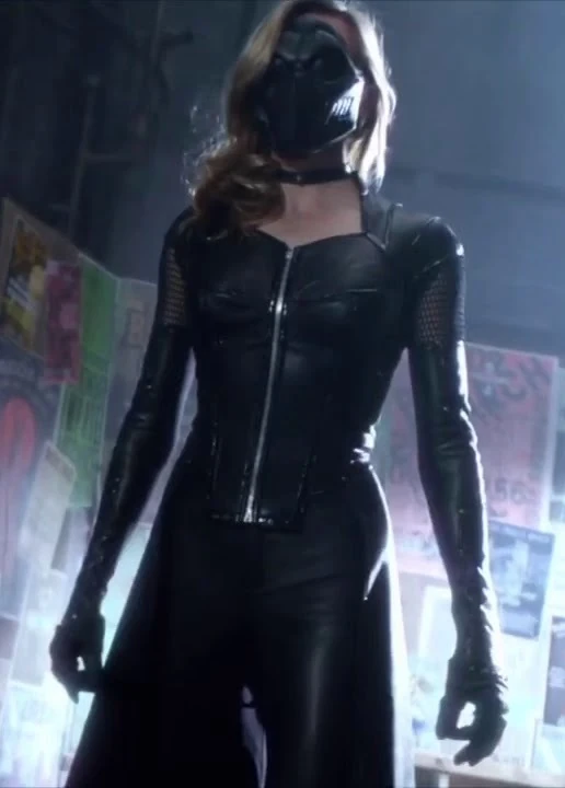 Laurel usa un traje de cuero negro. Parte del traje incluye una blusa con dos faldones que llegan hasta la rodilla, mangas largas que están conectadas a la parte superior con material de rejilla debajo de los hombros junto con un par de guantes de cuero negro que los hacen parecer como guantes de ópera y una cremallera en medio de su pecho. También usa pantalones de cuero negro con detalles en las rodillas, también de tela de rejilla, que se asemejan a rodilleras y tacones altos. Además, Laurel lleva una gargantilla de cuero negro alrededor del cuello con una campana dorada en el medio. Laurel también usa una máscara holográfica sobre su cabeza para ocultar su identidad.
