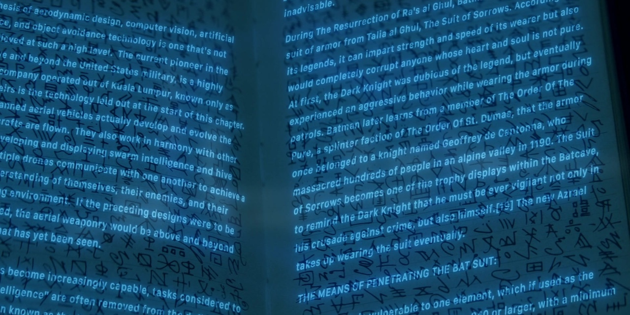 - When Alice uses the glasses, the camera cuts to show an excerpt from the journal. The relevant passage is taken from this Wikipedia page: Batsuit.[1][2]