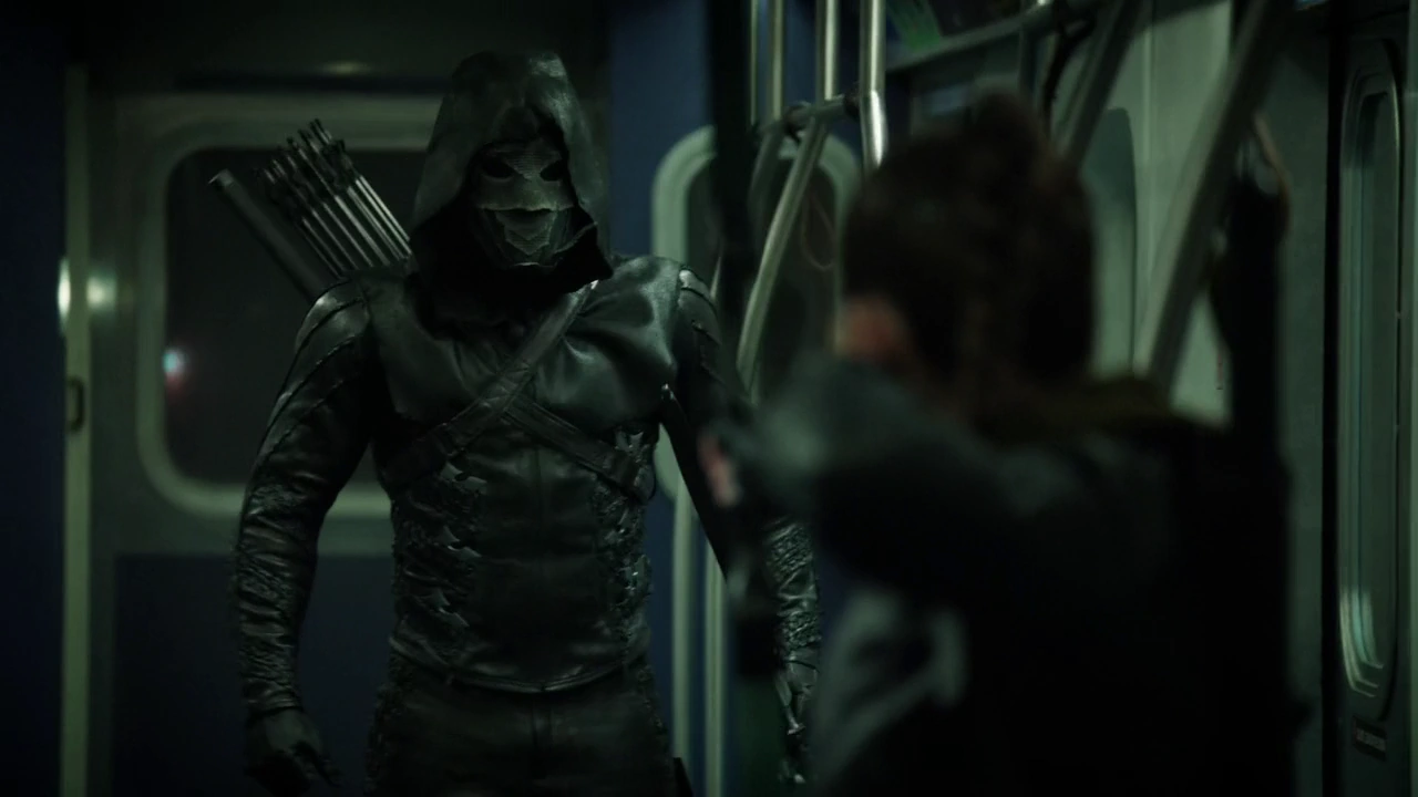 Later, Susan Williams reported on Prometheus' murders on the news, which Adrian told Oliver was a disaster. After Susan dubbed him the "Throwing Star Killer", Adrian admitted to Oliver that it had a "certain flair". Finding more six more potential victims after discovering Prometheus' pattern, Team Arrow sent a member to each one. Prometheus went after a train driver, but was confronted by Artemis. They engaged in a brief duel where Artemis managed to cut his right arm before Green Arrow came to her rescue, shooting an arrow into Prometheus' back. Instantly recognizing it as an explosive arrow, Prometheus threw it onto the roof where it exploded and escaped through the hole made. However, he left a bomb which blew up the train, though Green Arrow and Artemis ultimately escaped with the train driver. Later, Prometheus snuck into Quentin's apartment and while the latter was passed out from drinking, he slashed Quentin's right arm, creating a wound just like the one Artemis gave him and left a shuriken to implicate Quentin.[6]