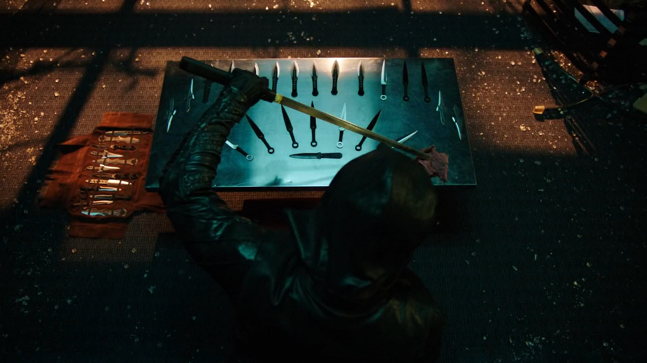 Chokuto: Adrian carried a chokutō, a short, straight-bladed guardless sword, on his back for close quarters combat which he used to murder Sam Conahan and his fights with Green Arrow. The blade is sharp enough to kill humans, like Sam Conahan. This was created along with his throwing stars for his quest for vengeance against the Hood for killing his father. He carried it in a sheath next to his quiver, and used it to kill Lieutenant Sam Conahan. He later maintained his sword and used it to attack Curtis Holt.