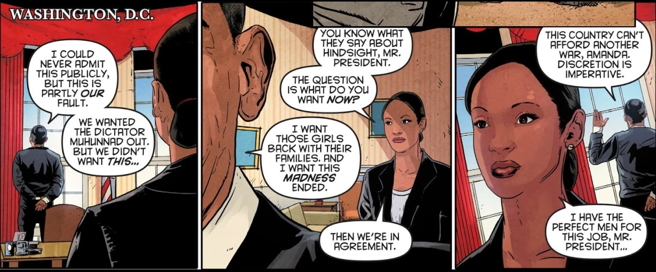On October 13, 2014 in Washingon, D.C., Obama was visited by Amanda Waller to talk about the Onslaught problem. He took partial responsibility for all of this, although he admitted that he would never publicly say anything like that. Obama asked Amanda to stop and avoid wars, and she claimed to have the perfect team.[4]