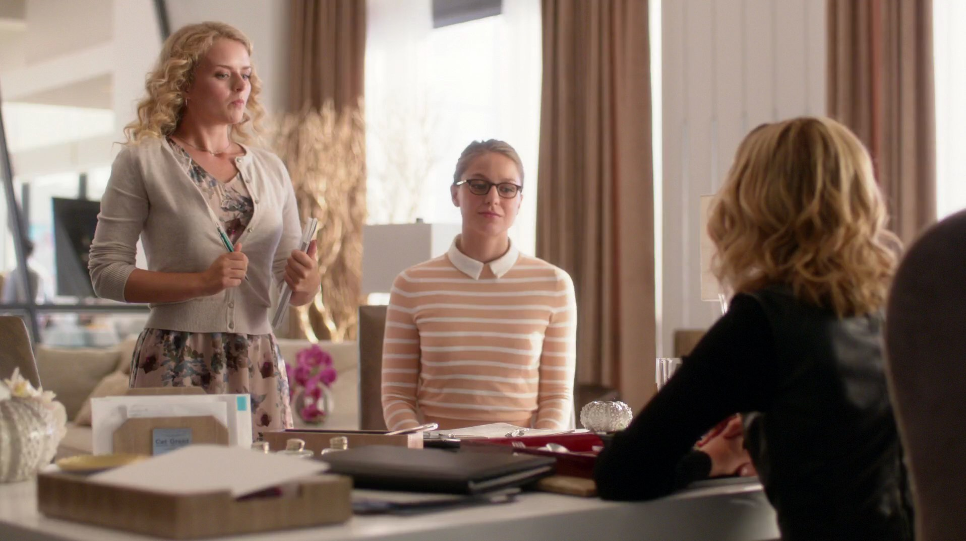 Cat Grant with President Marsdin aboard Air Force 1 as she speaks with Rhea.