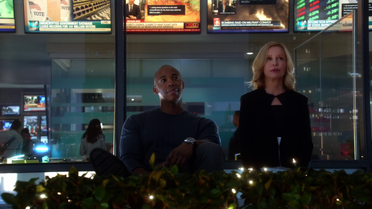 Cat asked everyone in for a conference call. Siobhan shows a package that Cat should see personally, but Cat wants it open for all to see, so James takes the package and opens it to find a letter and thumb drive. An unimpressed Cat tells Siobhan to have the drive microwaved. When the monitors and other electronic devices start to go haywire. A blonde woman appears on all of the screens calling herself Indigo. She tells Cat that she ignored what was on the drive, and warns her that she will bring chaos to National City. Cat orders Winn to fix the systems. The city begins to panic. Cat tells Siobhan to call her investment broker, but she stammers for a moment before Kara took the assignment. Cat tells James to get every reporter on this latest cyber attack.[20]