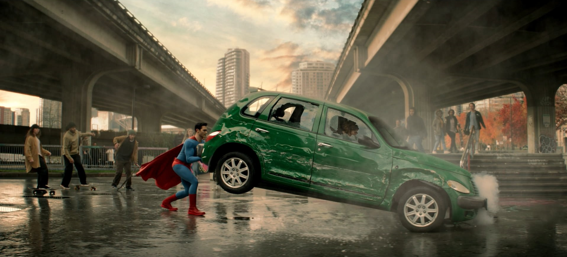 Clark later moved to Metropolis, where he began searching for apartments to rent. He was then alerted to a rogue car swerving across the road, causing Clark to make his first appearance to the world after saving the car from falling off of bridge and onto a young boy. As people found themselves awestruck by the hero, Clark discreetly changed in a phonebooth before a woman on her way to the scene mentioned that the Daily Planet should hear about the rescue.
