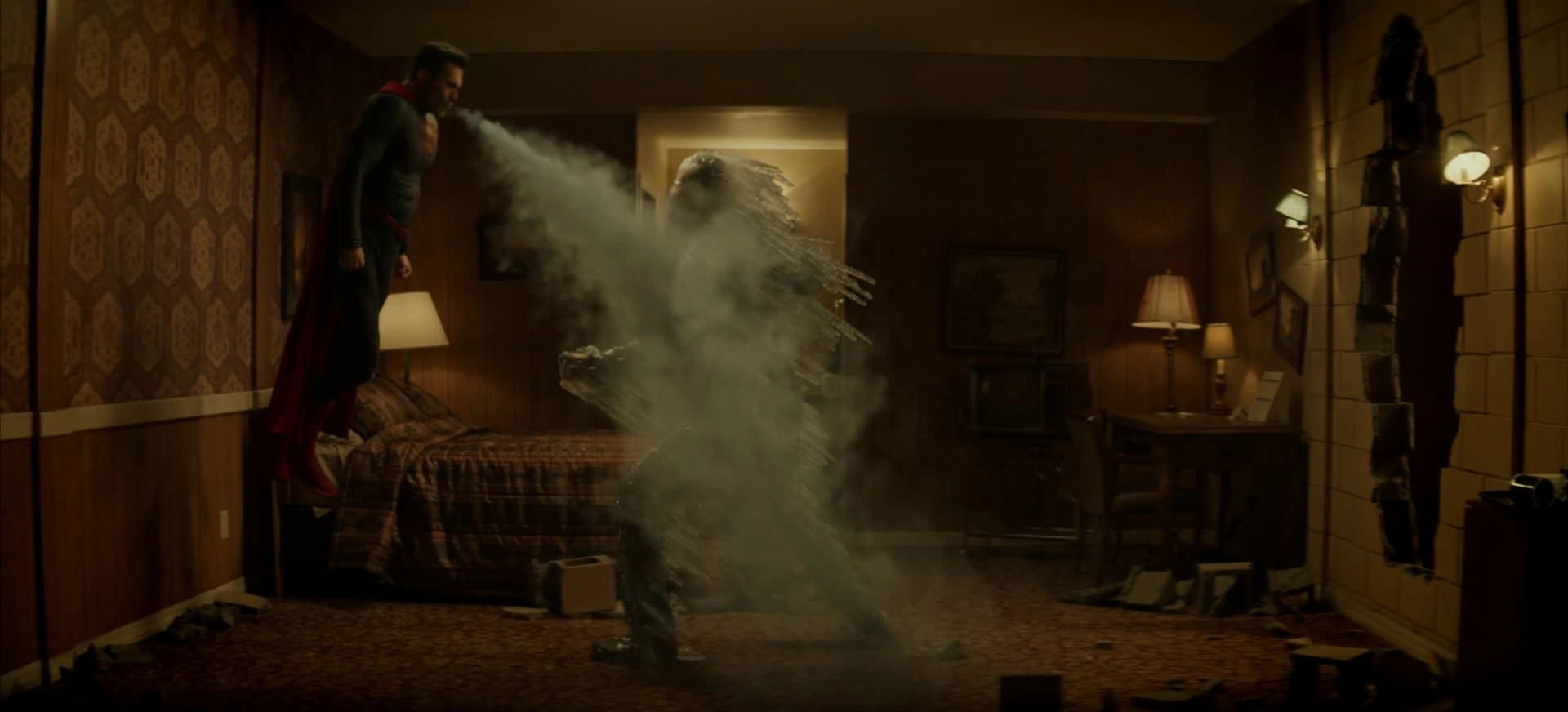 Superhuman Breath: Thanks to his incredible lung capacity, Clark is also able to draw in large amounts of air and then expel it all to create gale and hurricane force winds to extinguish fires. He can also chill his breath to freeze targets. His lungs can also go for remarkably long periods of time without needing air.
