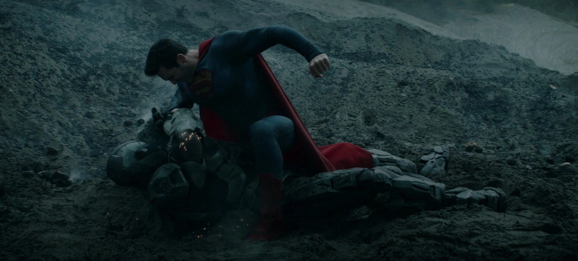 Clark then engages in a fierce aerial battle with Lex Luthor, surrounded by blue lightning as they exchange powerful punches. Moments later, Kryptonian bullets and screws strike Clark, but he manages to extract them using his remaining strength before healing instantly and resuming the fight by delivering a series of blows to Lex. Eventually, Clark's anger and rage surge, shattering Lex's war armor into countless pieces, watching as Lex plummets rapidly back toward Earth's atmosphere. Clark then embraces Lois Lane and their sons, Jordan and Jonathan, in a heartfelt hug.[1]