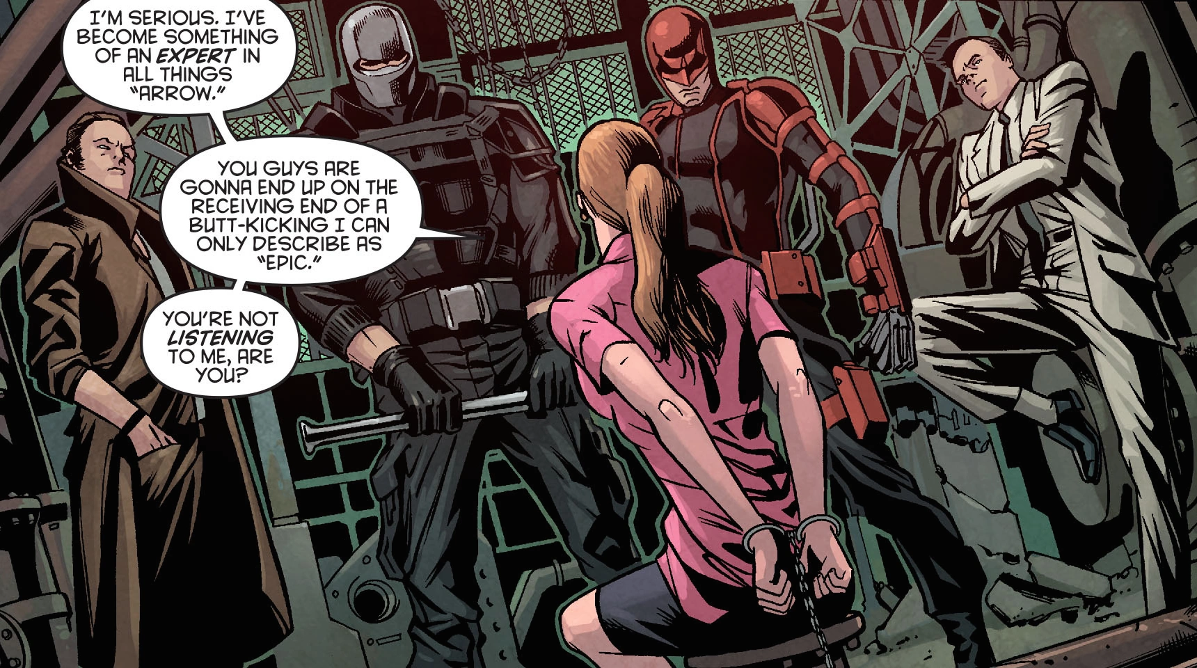 A couple nights later, Vanch talked with Vivian about how he wanted to claim a piece of the underworld in the face of the power vacuum in the city, which required him to impress the Chinese Triad, Bertinelli crime family, and other leaderless gangs. The Hood secretly listened to their conversation with a trick arrow but was forced to leave when a guard managed to fire his gun before being taken down. Vanch and Vivian heard the fight and found the trick arrow. Vanch then decided to eliminate the vigilante to ensure his business' success.