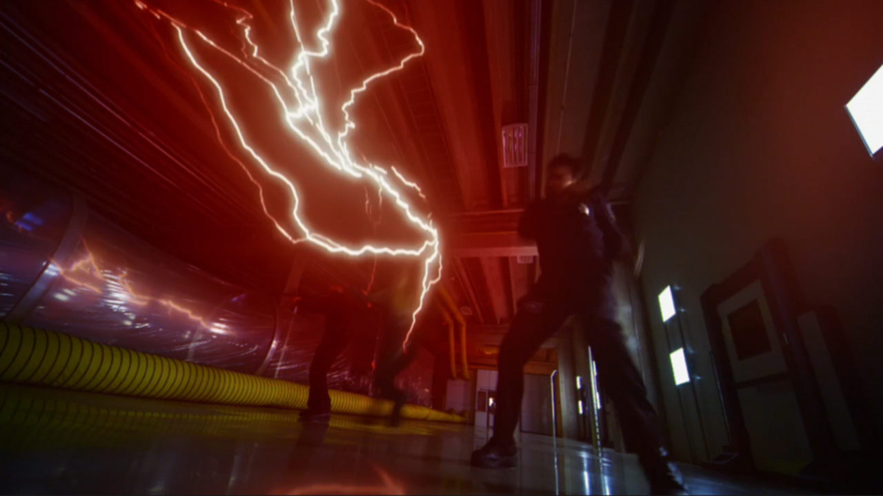 After Tina finished the work at 9:52 pm, Eobard prepared to kill McGee anyway but Flash arrived, subdued him, and destroyed the machine. Angered but soon unwavered by his nemesis's sabotage to his trip home, Eobard said he would find another way to travel to the future and boasted his superiority to Flash before issuing a challenge to catch him. Both Reverse-Flash and Flash began racing throughout the streets of Central City, but Flash managed to anticipate his path and intercepted him, culminating with Flash catching Reverse-Flash. Flash proceeded to severely beat Reverse-Flash almost to death in a fit of rage for his future actions. Only reluctantly stopping himself from delivering a death blow, Flash instead knocked him out and placed him in the pipeline prison at S.T.A.R. Labs.