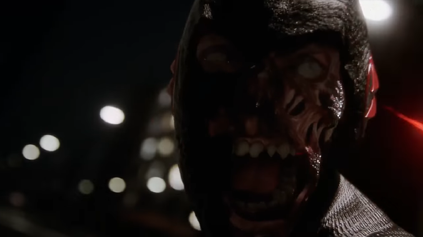 Eobard traveled to the midnight of April 25, 2024, and fought The Flash, Green Arrow, Atom and Hawkgirl in the streets of Central City, causing the most destruction the city had ever seen. The fight also somehow caused the sky to turn a deep crimson color. Their fight caused several trucks to start leaking their contents onto the streets, and caused power outages spread over 20 blocks throughout the city. The speedsters then started battling over two overturned tanker trucks, and the lightning emitted from them caused the oil from one of them to ignite. While sounded by smoke, the two speedsters had a very heated conversation on an unknown matter before speeding off, leaving the Green Arrow, Atom, and Hawkgirl behind. The two then continued their fight up and down an unknown avenue before Flash and him vanished without a trace in an explosion of light.[11] According to Iris West-Allen in 2049, some sources describing the battle claimed that the Reverse-Flash controlled an army of shadow demons and that the Flash was instead or also aided by Batwoman, Elongated Man and Supergirl.[18]