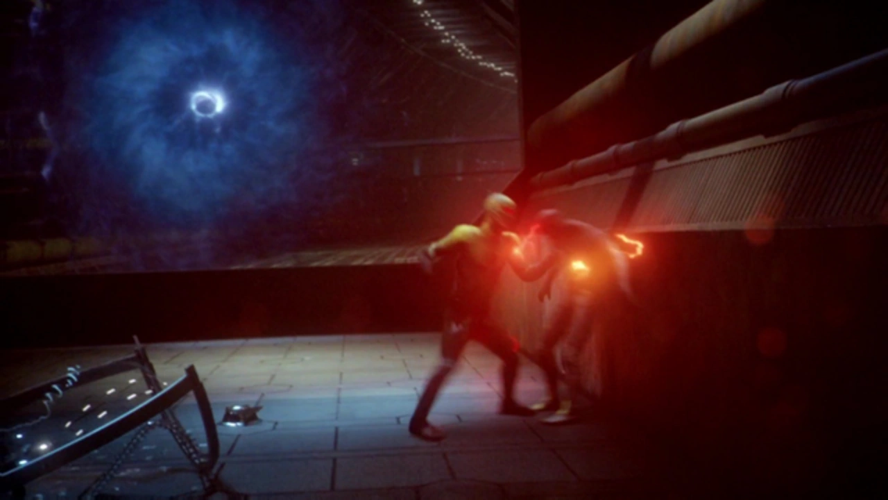 Eobard was released from his cell and informed of Team Flash's alternate method of sending him back to the future, to have both him and Flash run at high enough speeds to create a wormhole through which Eobard can return to his own time. Eobard also gloated of winning again, mockingly speaking in the past tense for all his future actions. As they prepared, Eobard vowed they would meet again and Flash agreed but also vowed to stop him every time, and both Flash and Reverse-Flash sped around the particle accelerator's ring. After gaining enough speed, the wormhole was created and Flash hurled Reverse-Flash through the portal and Reverse-Flash successfully returned to his own time.[6]
