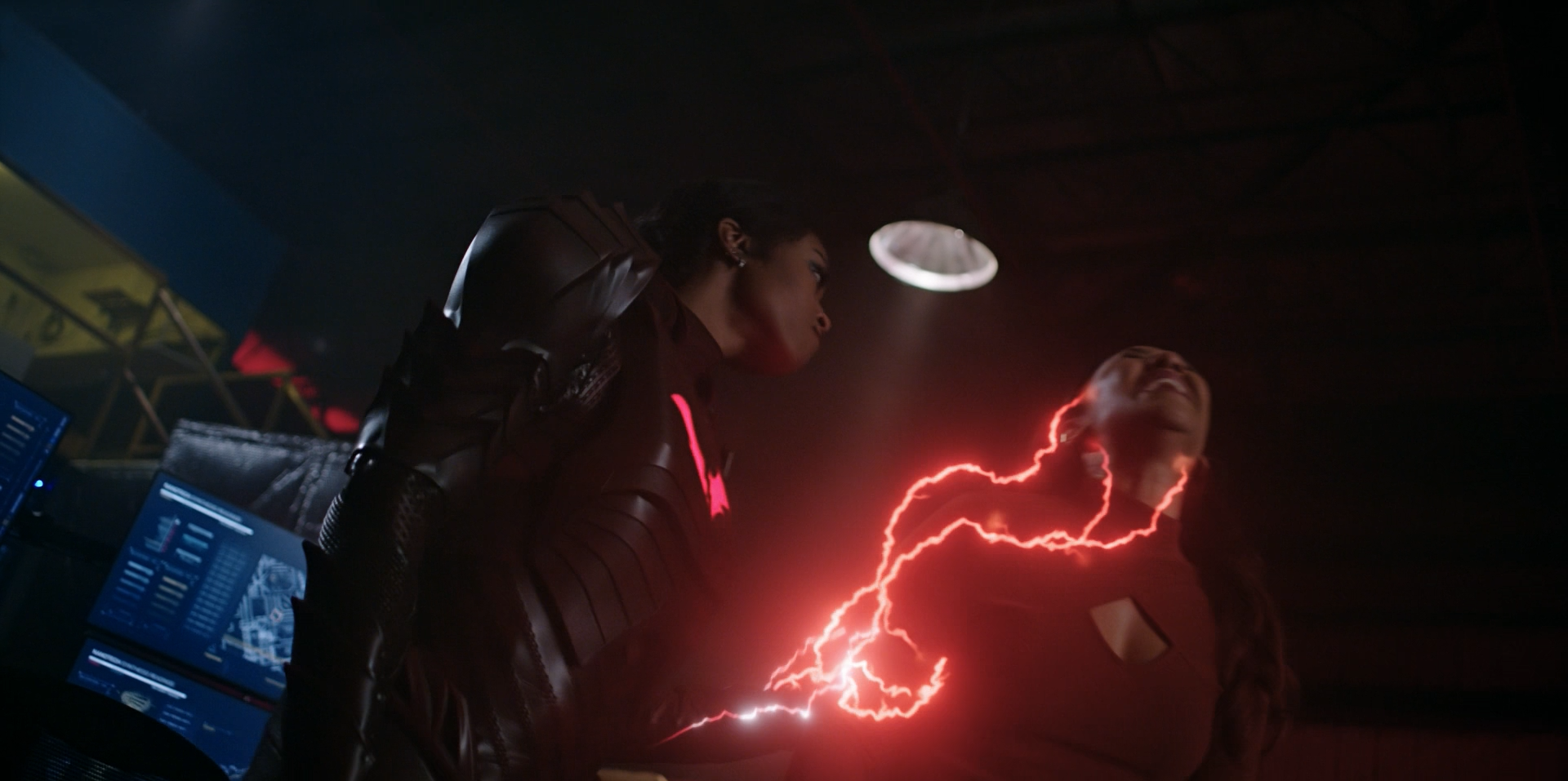 With Barry, Cisco, and Frost gone to fight Eva, Iris joined the B-squad at comms. When Eva began to get the upper-hand, Iris realizes that brute force would not bring victory, so she uses a smoke bomb to teleport to Eva's location and try persuading her to desist.