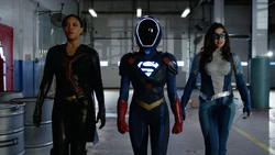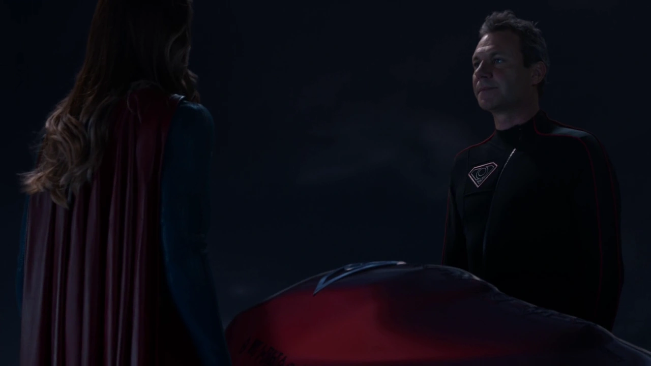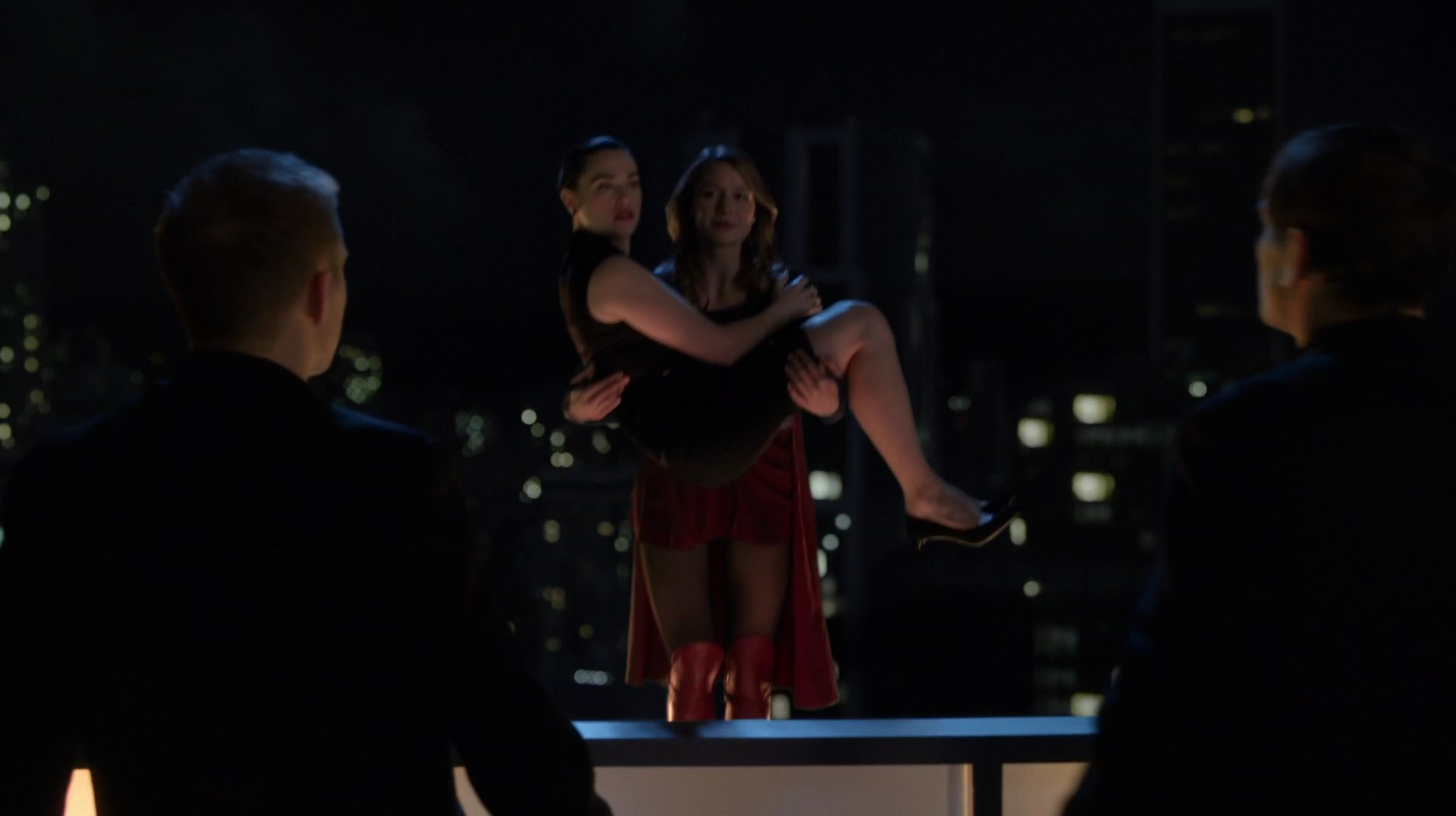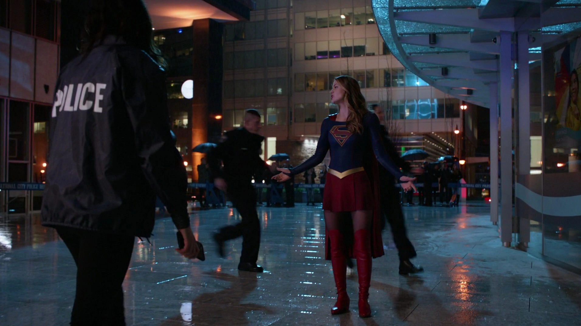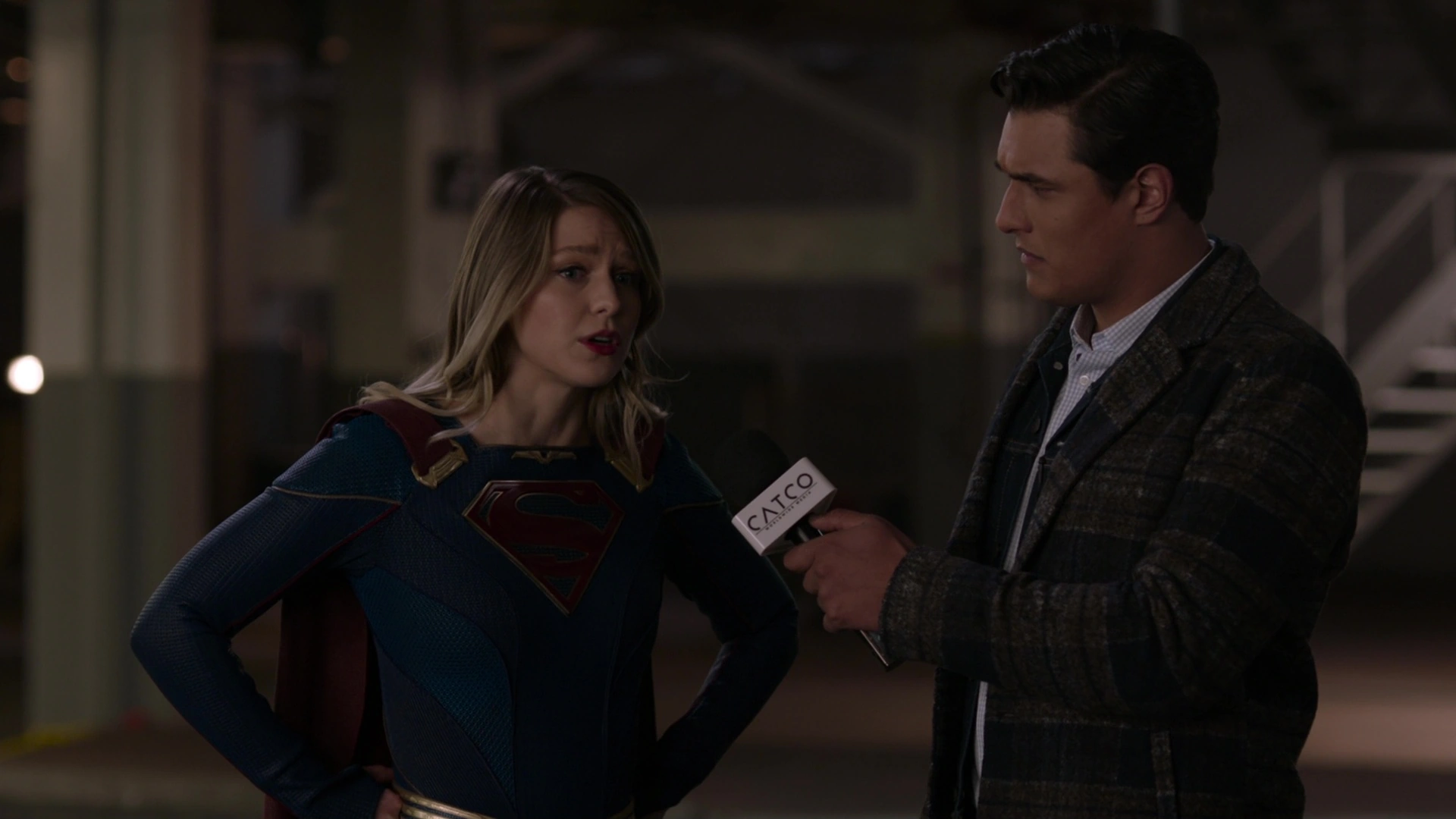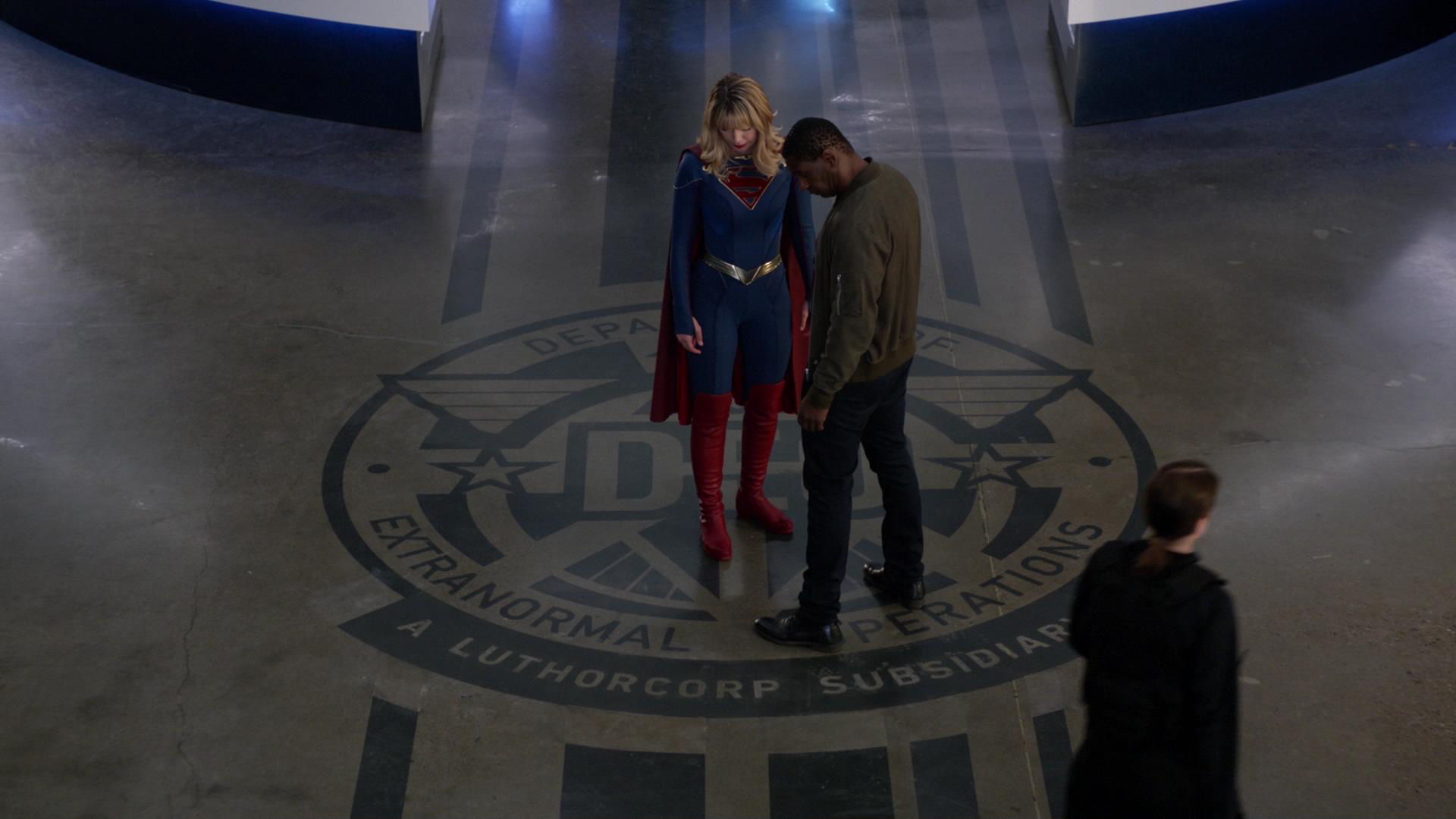 Kara flew to the accident site, where she was joined by Superman, and together they prevent catastrophe, to cushion the fall of the shuttle. Kara arrives in D.E.O., bringing Superman with her to shows him the man they had found into the pod the previous night. Then Clark decides to join the investigations on the fall of the shuttle and offers to go to CatCo with Kara. There Kara apologizes to James for having interrupted their date and appoint a new one. After this Kara and Clark go to the Luthor Corp, to talk with Lena Luthor, who explains that she refused at the last moment to flight on the Venture due to an emergency meeting on the renaming of the company and is not related to the accident. Later Lena Luthor's helicopter was attacked by drones, but Supergirl and Superman saved her, destroying them, and then Supergirl told Lena that someone wants to kill her. Later, Kara tried to talk Lena out of doing her speech, but she said that she should do it. During her speech John Corben attacks Lena but she was saved by Supergirl while Superman supports a building from collapsing on a square full of people.