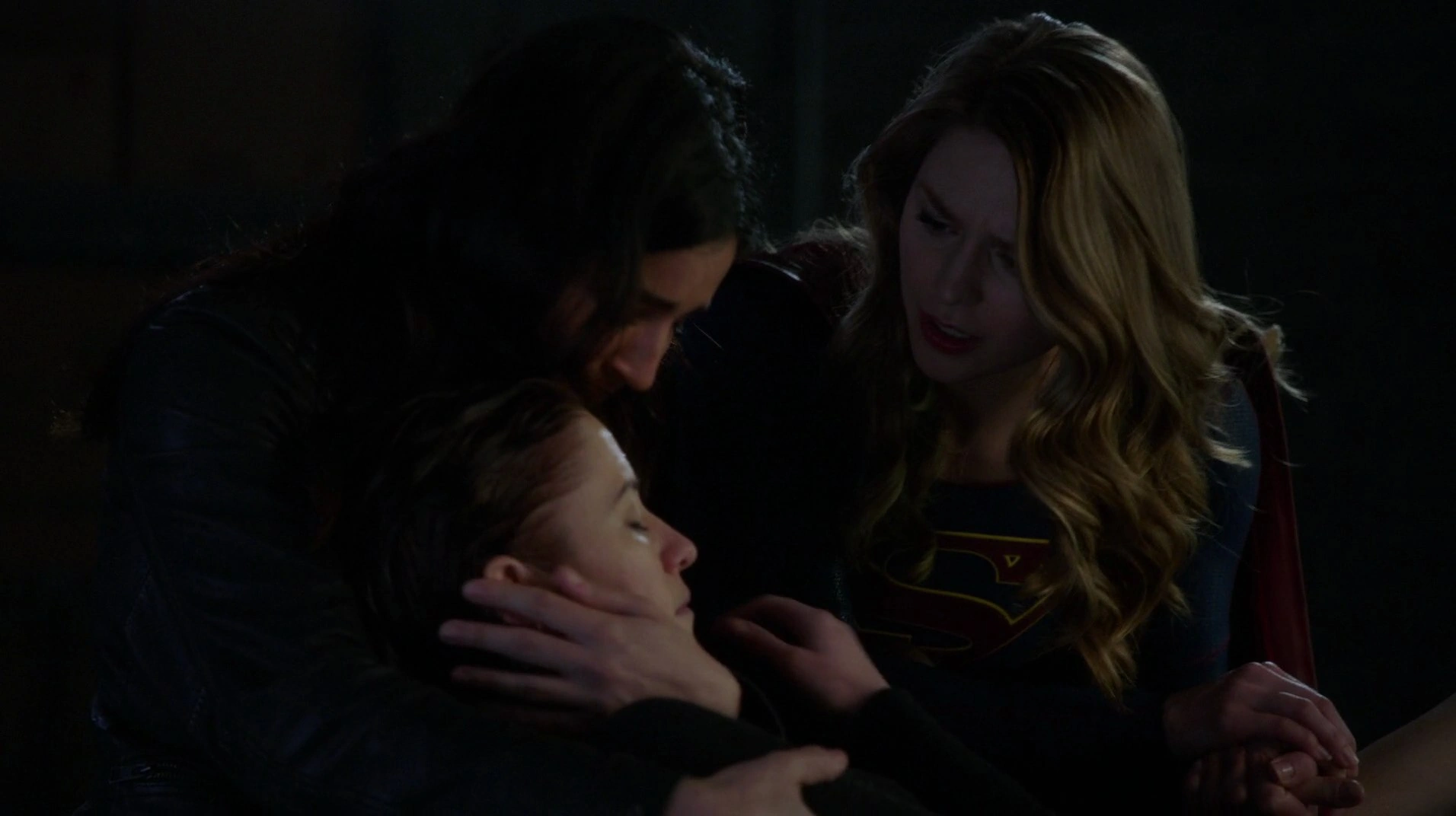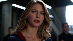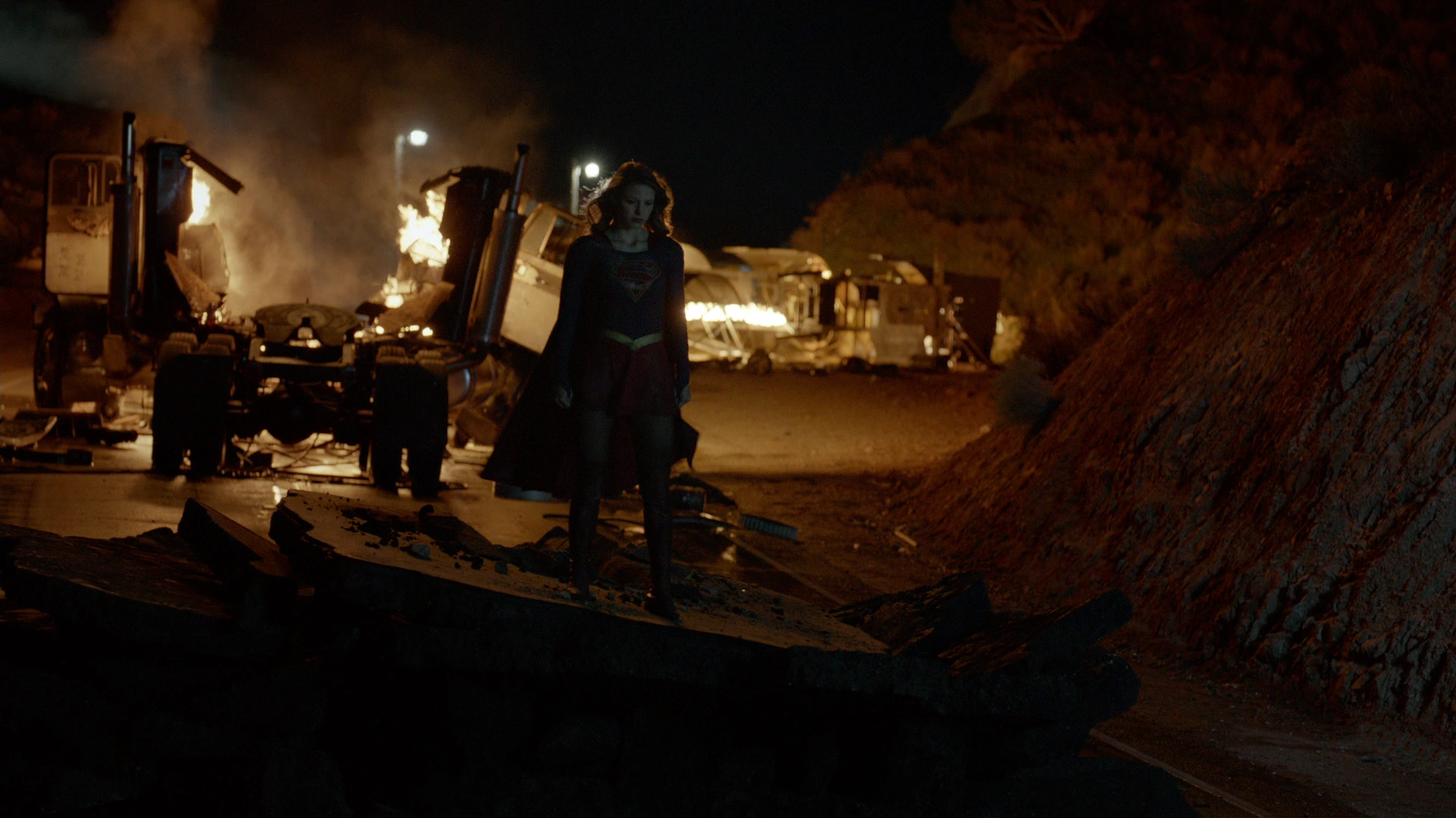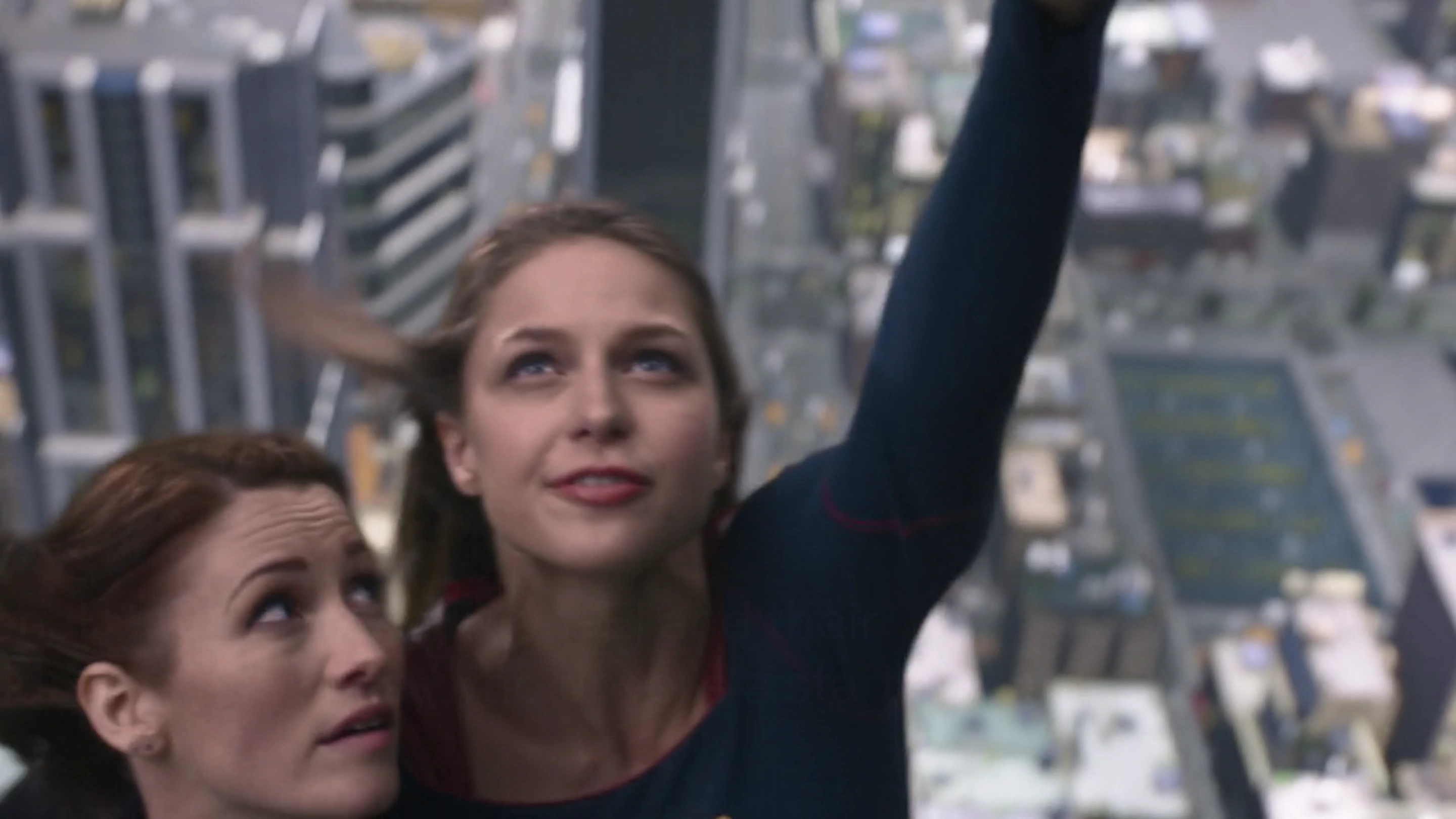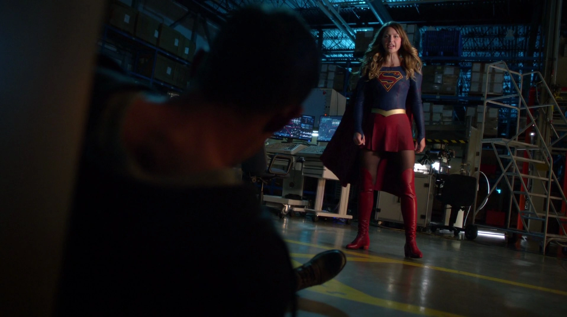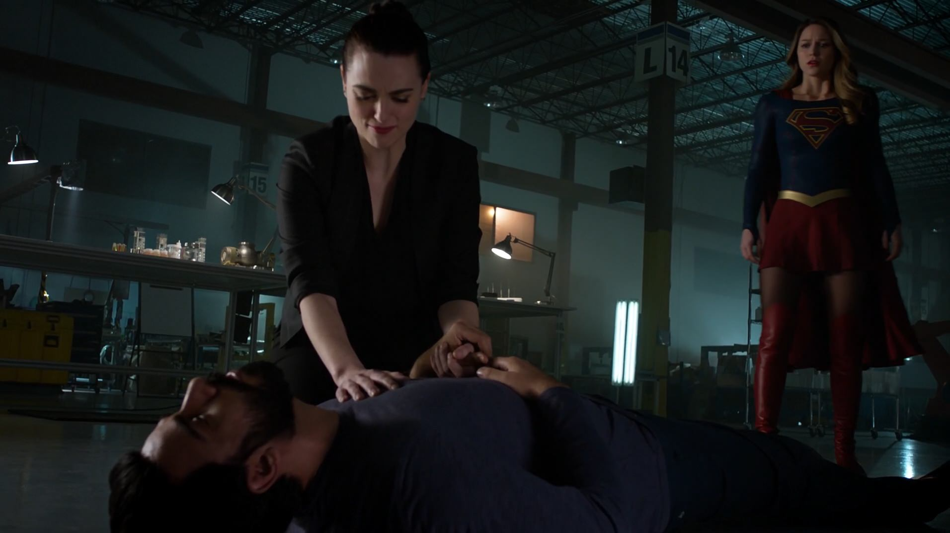 Kara flew to the accident site, where she was joined by Superman, and together they prevent catastrophe, to cushion the fall of the shuttle. Kara arrives in D.E.O., bringing Superman with her to shows him the man they had found into the pod the previous night. Then Clark decides to join the investigations on the fall of the shuttle and offers to go to CatCo with Kara. There Kara apologizes to James for having interrupted their date and appoint a new one. After this Kara and Clark go to the Luthor Corp, to talk with Lena Luthor, who explains that she refused at the last moment to flight on the Venture due to an emergency meeting on the renaming of the company and is not related to the accident. Later Lena Luthor's helicopter was attacked by drones, but Supergirl and Superman saved her, destroying them, and then Supergirl told Lena that someone wants to kill her. Later, Kara tried to talk Lena out of doing her speech, but she said that she should do it. During her speech John Corben attacks Lena but she was saved by Supergirl while Superman supports a building from collapsing on a square full of people.