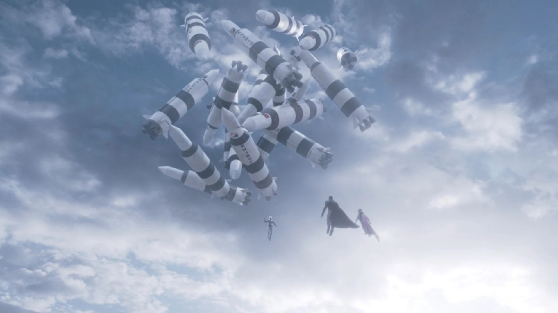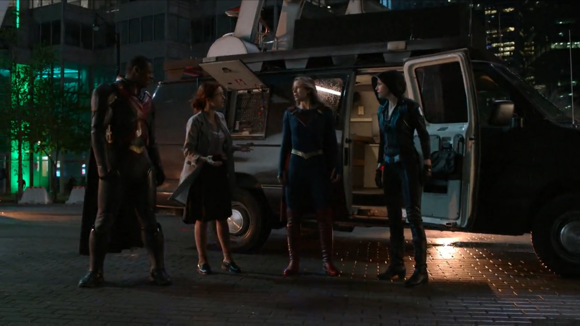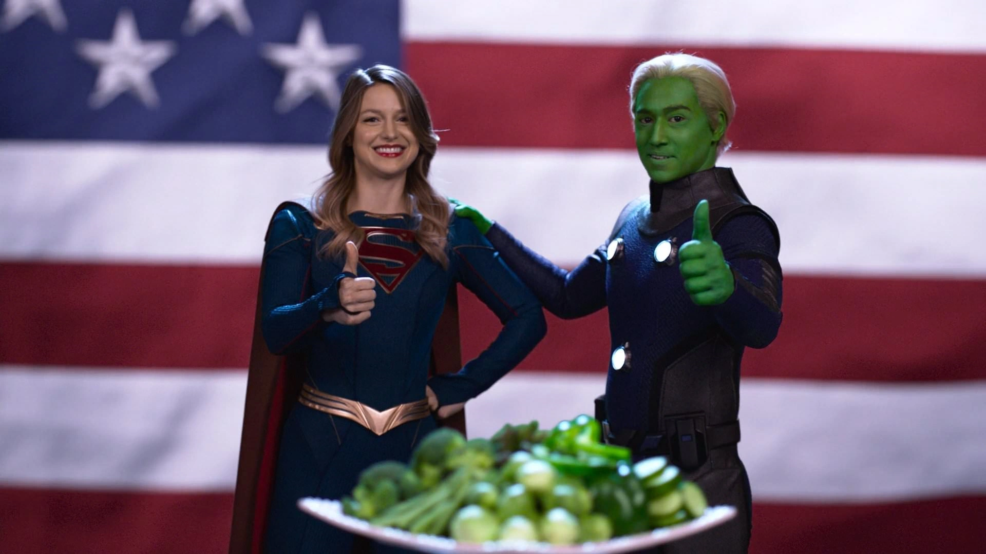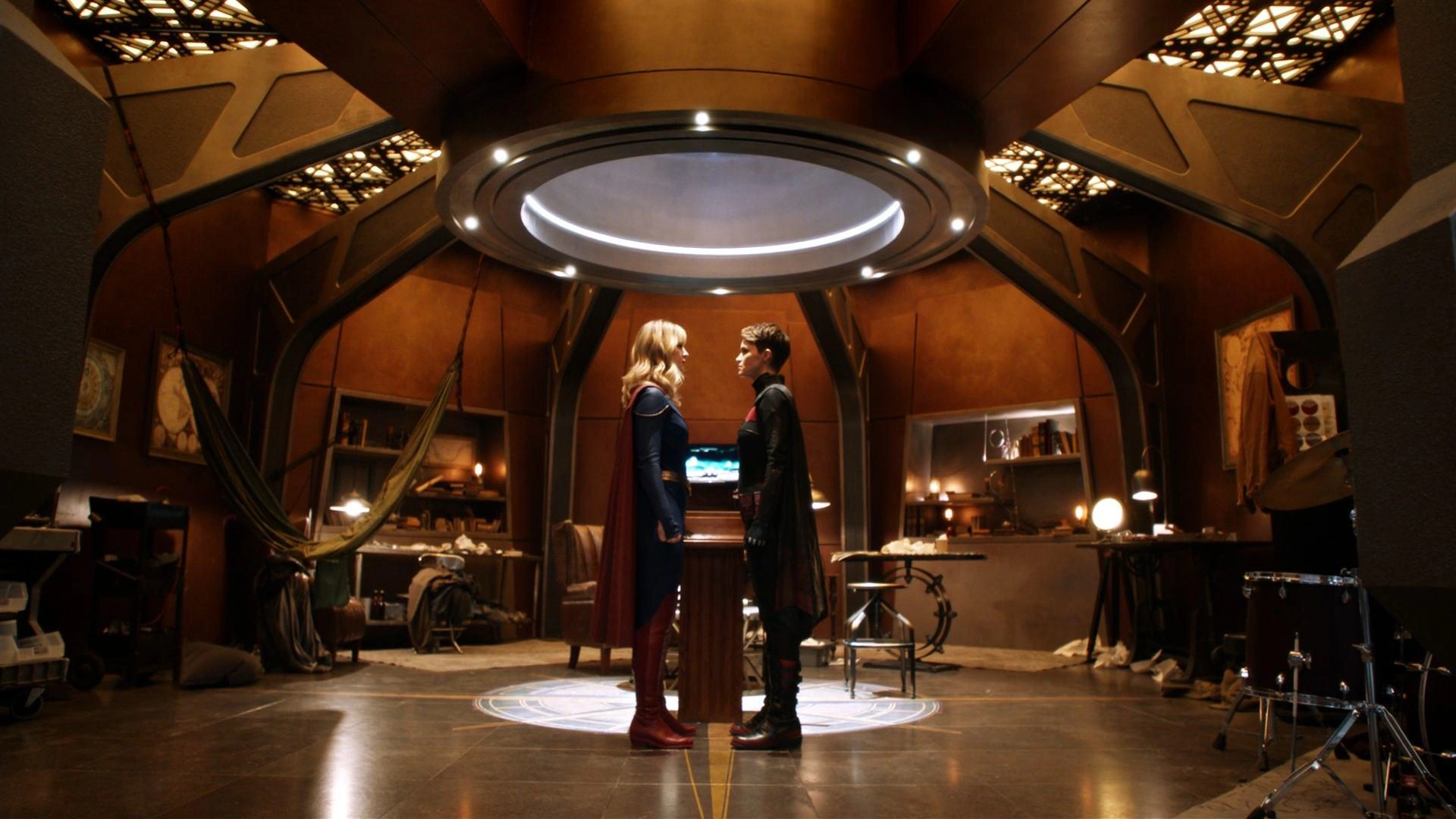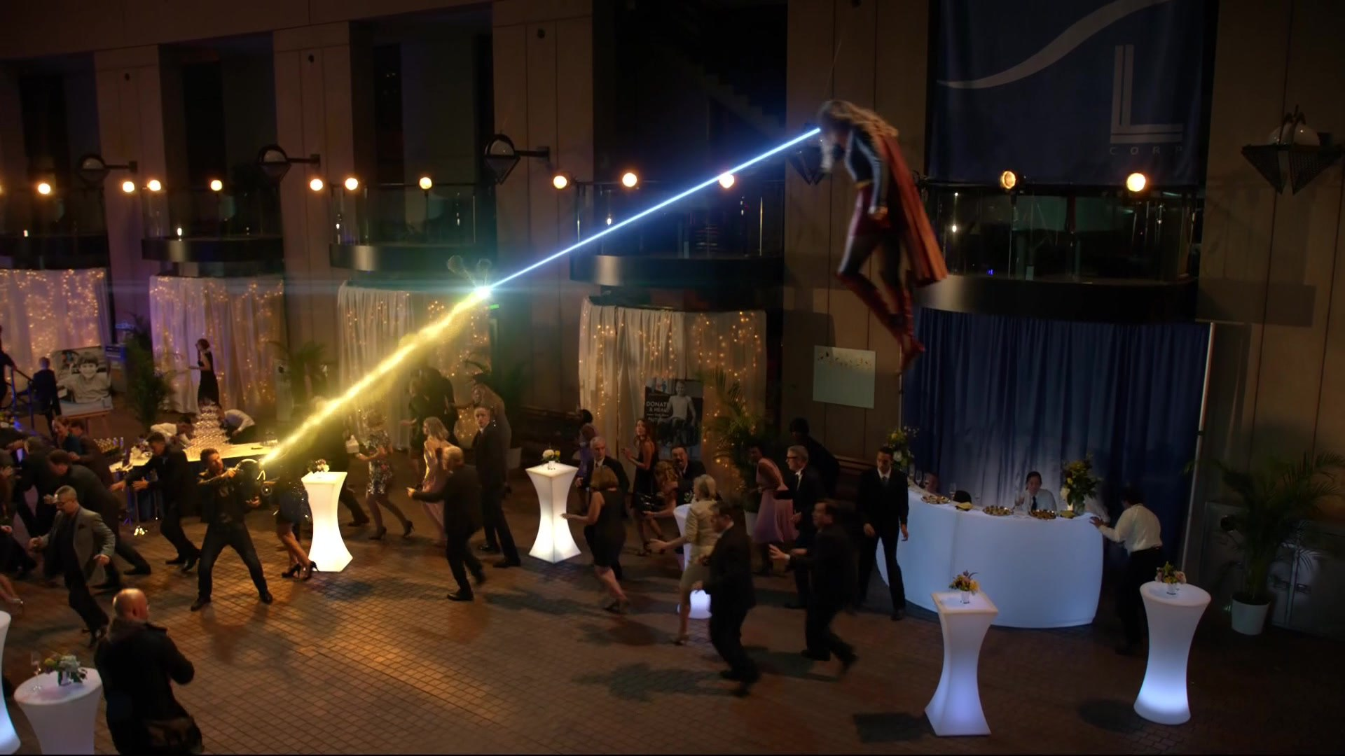 Kara flew to the accident site, where she was joined by Superman, and together they prevent catastrophe, to cushion the fall of the shuttle. Kara arrives in D.E.O., bringing Superman with her to shows him the man they had found into the pod the previous night. Then Clark decides to join the investigations on the fall of the shuttle and offers to go to CatCo with Kara. There Kara apologizes to James for having interrupted their date and appoint a new one. After this Kara and Clark go to the Luthor Corp, to talk with Lena Luthor, who explains that she refused at the last moment to flight on the Venture due to an emergency meeting on the renaming of the company and is not related to the accident. Later Lena Luthor's helicopter was attacked by drones, but Supergirl and Superman saved her, destroying them, and then Supergirl told Lena that someone wants to kill her. Later, Kara tried to talk Lena out of doing her speech, but she said that she should do it. During her speech John Corben attacks Lena but she was saved by Supergirl while Superman supports a building from collapsing on a square full of people.