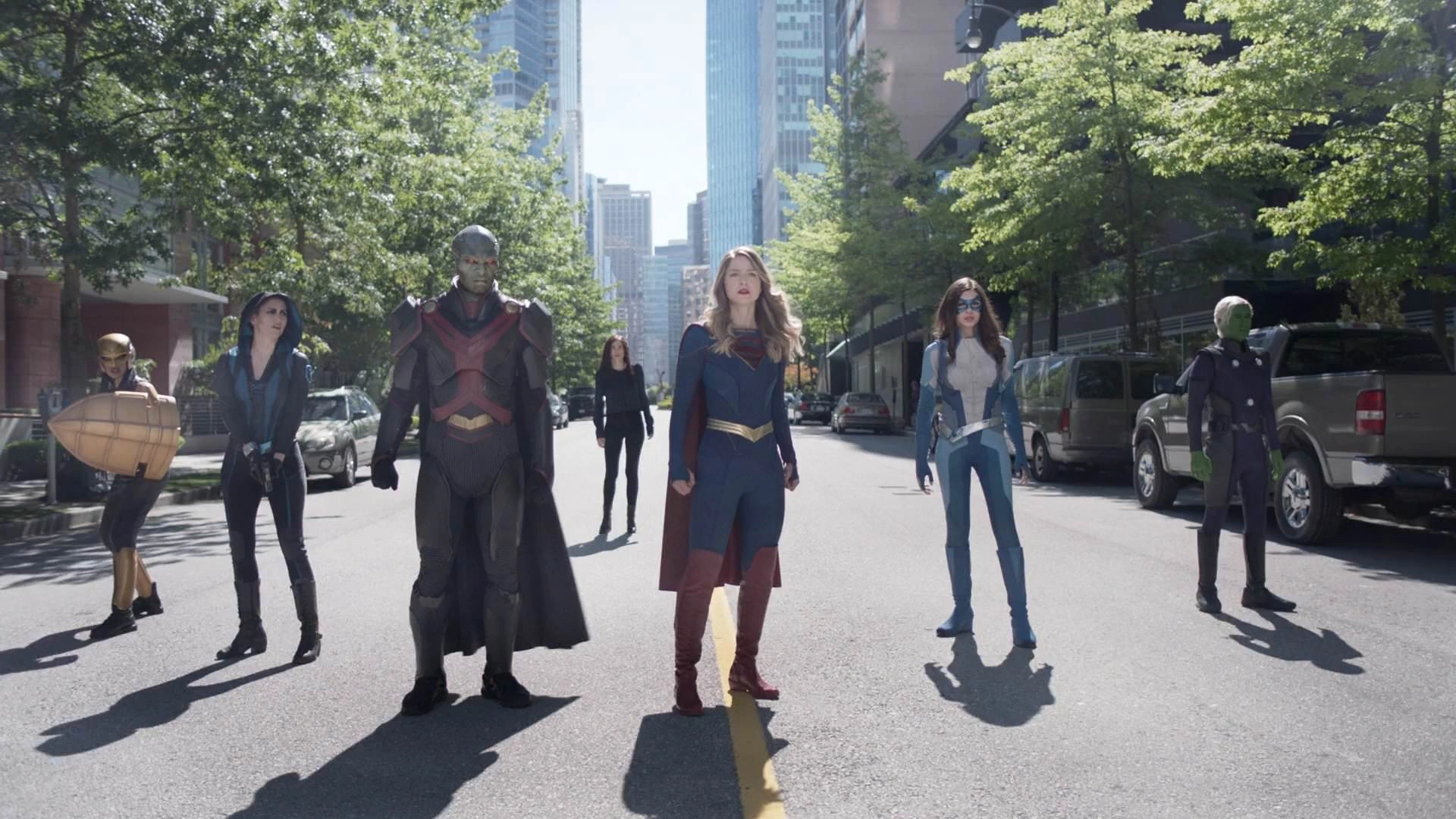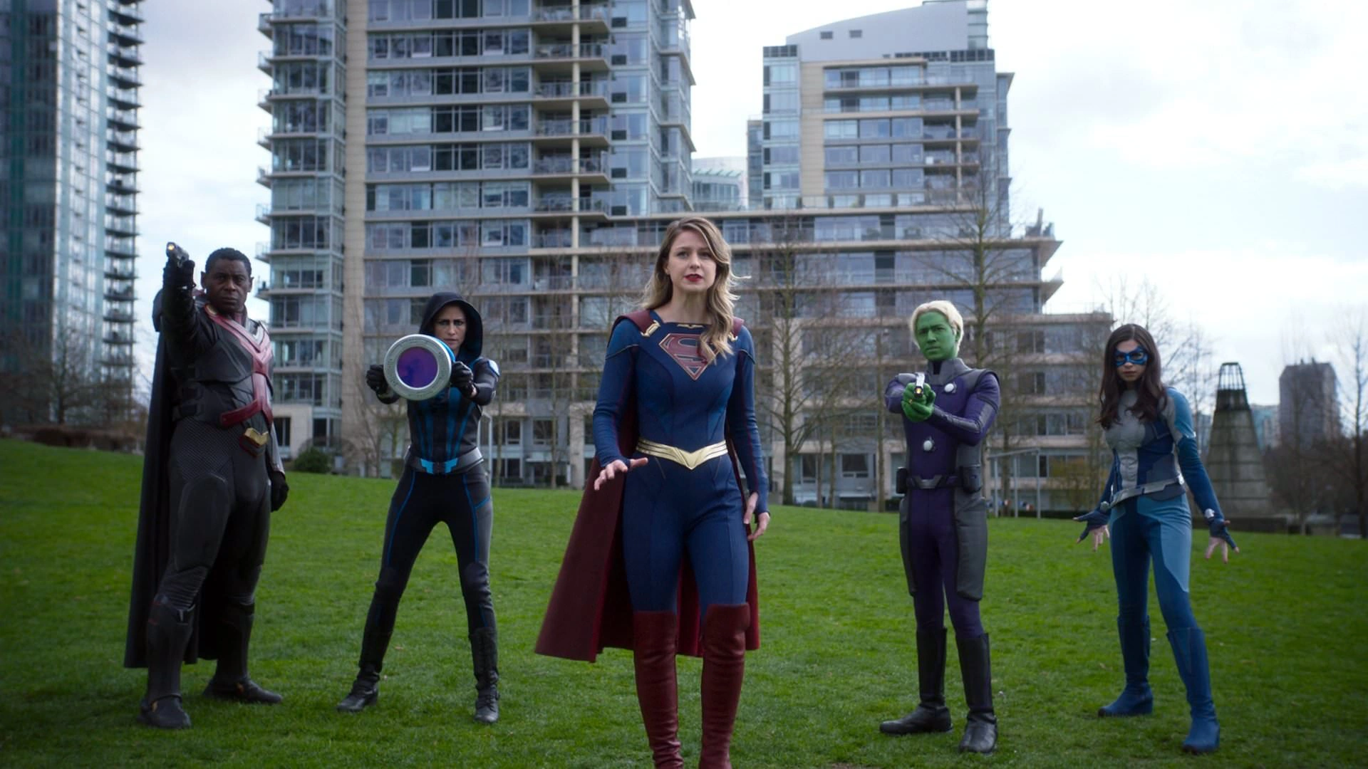 Back at the D.E.O., Kara was contacted by James, telling her than Cat Grant had been kidnapped by Livewire and Siobhan, now known as Silver Banshee. Utilizing ear bud-type devices, the two villains were quickly defeated, along with the help of National City citizens and the fire department. Later, Barry and Kara returned to the desert. They combined their speed in a race, with Kara throwing him through a portal that was created. Later at her apartment, Kara and James shared a kiss, though afterwards she was surprised to see him walk away with a blank stare, and joined hundreds of other people marching blankly down the street, all under the control of Myriad.[36]