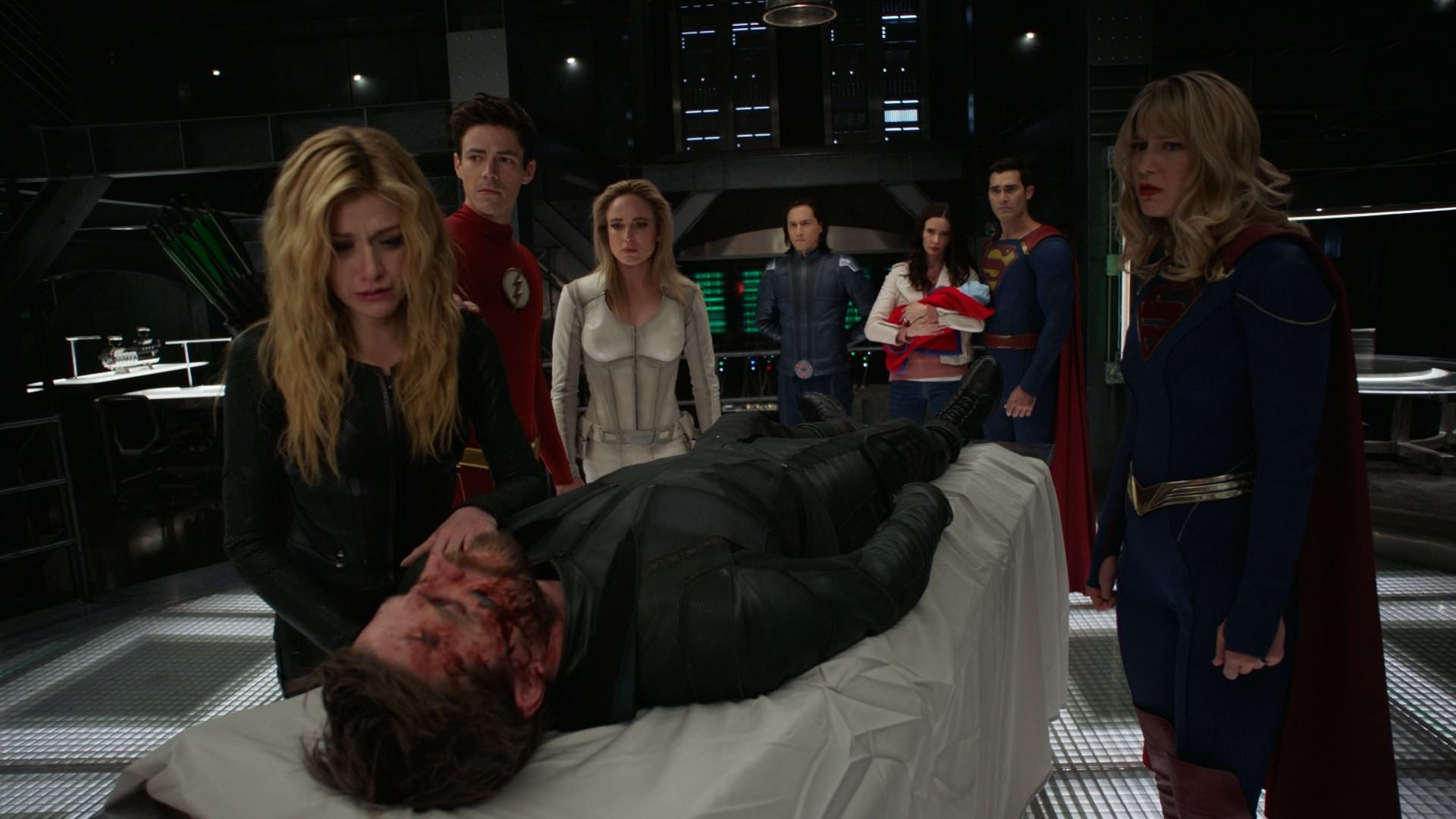 Kara along with Winn later took Siobhan to the D.E.O. after she had fell from a roof, as she'd displayed the power to save herself. Later at CatCo, Kara was sent flying by Siobhan using her sonic scream. However, The Flash saved Kara, who had opened a breach from his universe while testing his speed. Kara proceeded to fly off but stopped in order to talk to him. Introducing himself and explaining that he was from another universe, he asked for her help to return. Kara took Barry to their makeshift base at CatCo, where he was introduced to Winn and James, explaining to all of them the concept of the multiverse. Promising to help him get home, Kara enlisted Barry's help with Siobhan and Livewire. She then took him to the D.E.O., introducing him to director Lucy Lane. Tracking Siobhan and Livewire, they found them at an abandoned warehouse. Despite being unsuccessful in their attempts to subdue them, Barry suggested that Kara needed to slow down and stop trying so hard, drawing from personal experience. Back at the D.E.O., Kara was contacted by James, telling her than Cat Grant had been kidnapped by Livewire and Siobhan, now known as Silver Banshee. Utilizing ear bud-type devices, the two villains were quickly defeated, along with the help of National City citizens and the fire department. Later, Barry and Kara returned to the desert. They combined their speed in a race, with Kara throwing him through a portal that was created. Later at her apartment, Kara and James shared a kiss, though afterwards she was surprised to see him walk away with a blank stare, and joined hundreds of other people marching blankly down the street, all under the control of Myriad.[36]