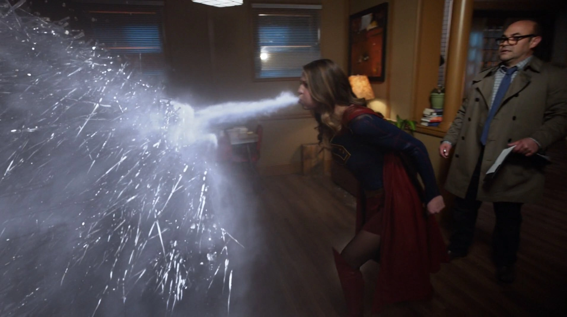 Freeze breath: Kara is able to exhale powerful gusts of air from her mouth which are similar to force winds. She can also cause the temperature of her breath to drop, therefore able to freeze nearly anything.[36]
