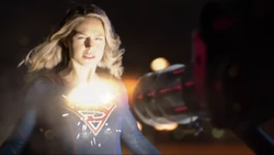 Kara heard a robbery happening nearby, showing up as Supergirl, and talked the robber out of it, with James snapping a photo of the event. She was later informed by Winn, that an adrenaline rush will restore her powers. After James almost fell down an elevator shaft trying to save CatCo employees on other floors, the moment allowed for Kara's powers to return. With her powers back, Kara stops several disasters, including a bus of children from falling off a bridge, and a fire at West National City Bank. Kara was later told by Winn that he was disappointed in her, for her actions with James, despite him having a girlfriend. She later thanked Cat Grant as Supergirl for her actions during her absence, and while flying, Kara was attacked by three Kryptonians, led by her Aunt Astra.[21]