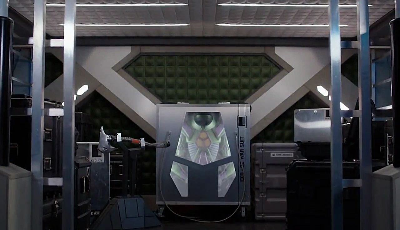 One of Lex's battle armors, the Lexosuits, stored in his mountain vault.