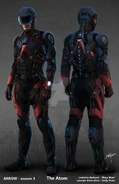 Superhuman Strength: The A.T.O.M. can somewhat increase its user's strength. When in motion, especially when it land hard after flight, it exerts great physical force, as much as a bullet, allowing it to give great damage to something as strong as concrete, easily creating large craters in concrete grounding when landing on it too hard. Its metallic composition can allow the physical force it generates to be as much as an object as hard as stone or metal, meaning a strike from the suit equals a strike from a metal or stone object with human strength or similar strength. The mechanism in the suit allows the wearer to exert great strength and force with inhuman ease. Ray was able to hurl Deathbolt across a room and into a wall, leaving a dent. When Felicity wore the suit, she was strong enough to catch and lift Oliver while flying with enough momentum. Strength is unaffected by the suit's shrinking, allowing Ray to physically overpower multiple opponents while shrunken and in flight. While small, Ray even used his flight to pierce clean through one of The Hunters like a bullet. Ray has even shown that he can use the energy weapons on his forearms while he is punching an opponent to further enhance his attacks. However, Vandal Savage managed to overpower Ray while the latter wore this suit, using Ray's own momentum against him.