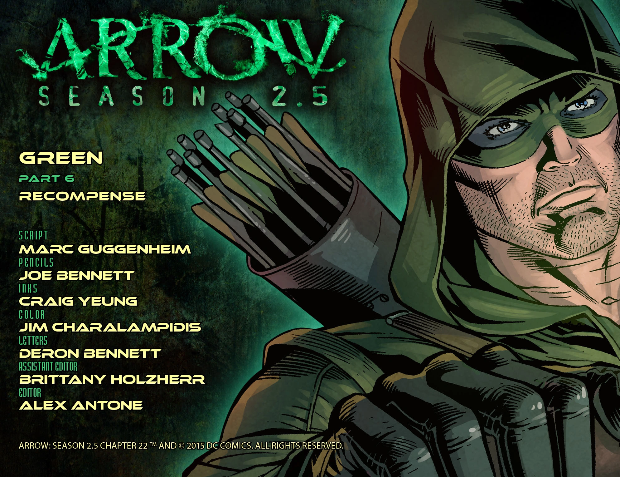 "Recompense" is the twenty-second chapter of the comic book series Arrow: Season 2.5, and the sixth chapter in the Green arc. It was released digitally on June 22, 2015.