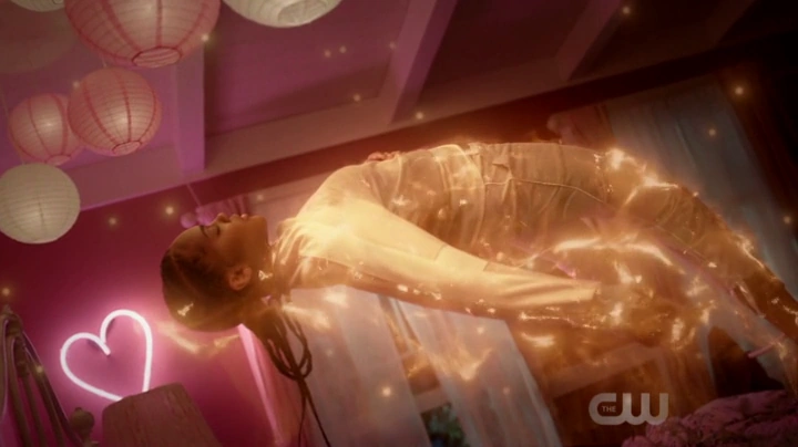 At home, Lynn and Anissa wait for Jefferson to help Jennifer who is sitting in the bath with lights and a field around her. Jefferson holds her close and absorbs the energy discharge, calming her powers.